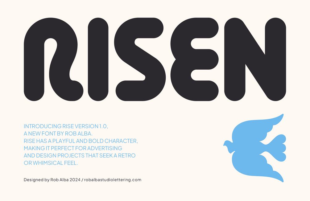 Introducing RISEN Version 1.0, a new font by Rob Alba. Risen has a playful and bold character, making it perfect for advertising and design projects that seek a retro or whimsical feel.